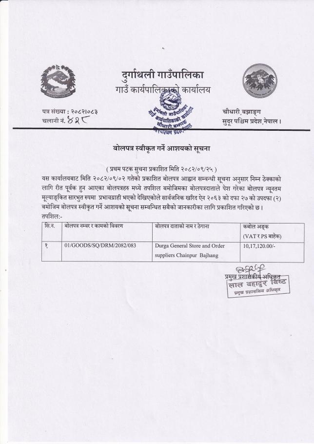 बोलपत्र स्वीकृत गर्ने आशयको सूचना