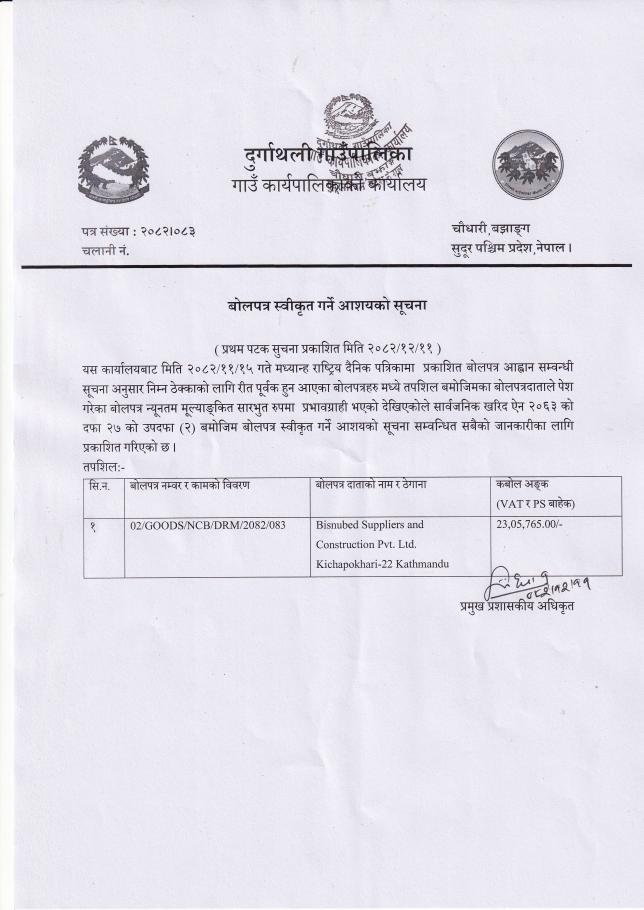 बोलपत्र स्वीकृत गर्ने आशयको सूचना