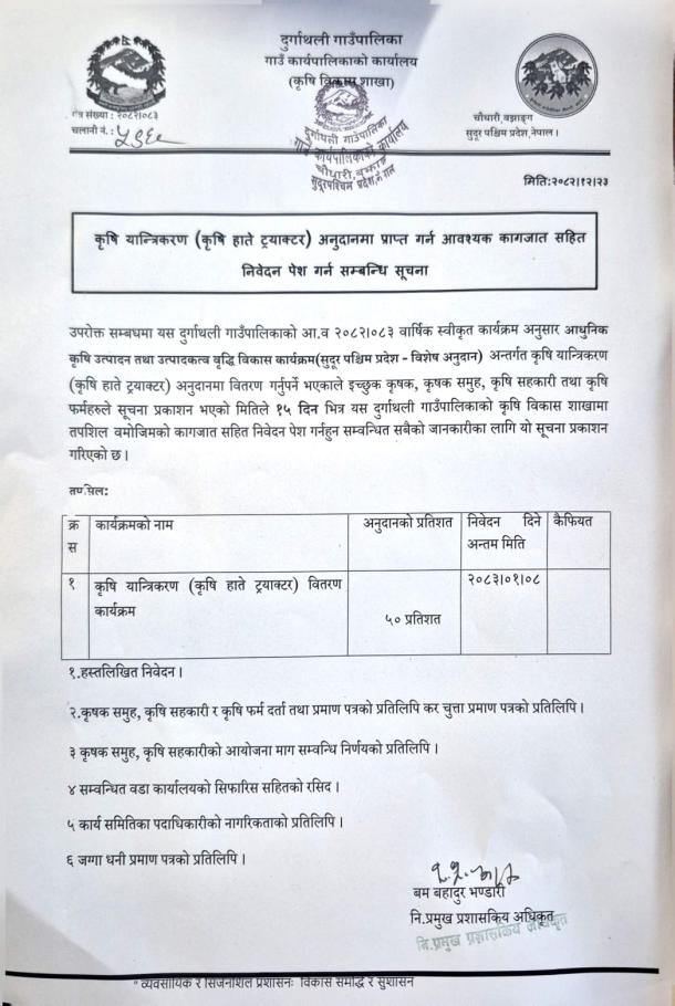 कृषि हाते ट्रयाक्टर अनुदान सम्बन्धी सूचना